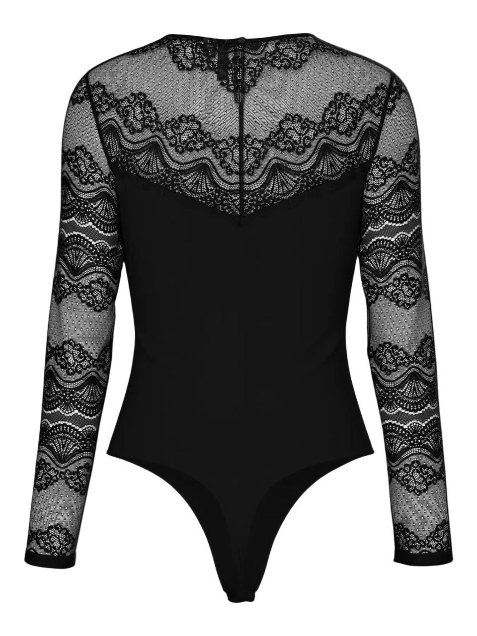 Body m/l con encaje. De color negro. De cuello redondo y abrochado en la espalda. Tejido fino y de tacto suave y agradable. Tejido de buena calidad y fácil lavado. Fabricado con procedimientos ecofriendly y respetuosos con el medio ambiente. Una prenda que siempre aportará un toque sugerente y glamuroso a tus looks. Además es ultraversátil y polivalente para combinar con una gran variedad de propuestas. Y no tiene fecha de caducidad. Apuesta al negro, valor seguro. Estilo casualwear.