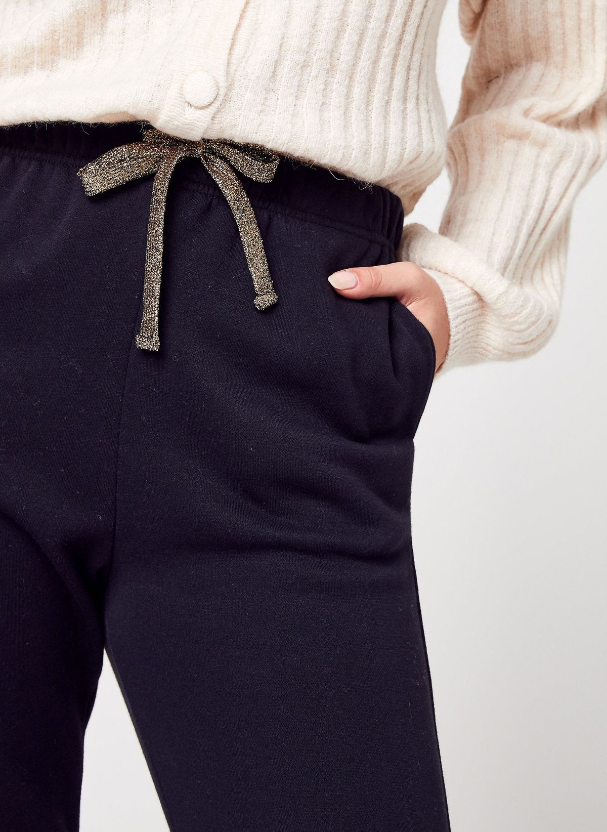 Chándal afelpado con cordón. De color negro y con cordón en dorado. Con dos bolsillos en los costados. Tejido de tacto suave y agradable. Tejido de buena calidad y fácil lavado. Fabricado con procedimientos ecofriendly y respetuosos con el medio ambiente. Tradición y vanguardia, unidas de la mano. Una prenda ultraversátil y polivalente que siempre podrás combinar a las mil maravillas con cualquier propuesta. Además siempre te aportará la máxima comodidad y comfort en tu día a día. Y con una relación calidad - precio espectacular. Apuesta al negro, valor seguro! Estilo sportswear.